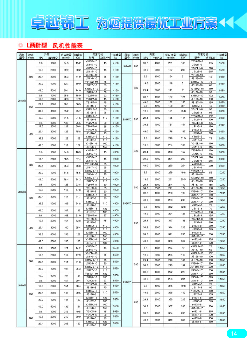 現在市場上的羅茨風機,很少再見到兩葉羅茨風機了,現存兩葉羅茨風機全是大風量的,基本上都被三葉羅茨鼓風機代替。但是在大流量條件下,兩葉羅茨風機還是有市場的,附兩葉羅茨風機參數表: