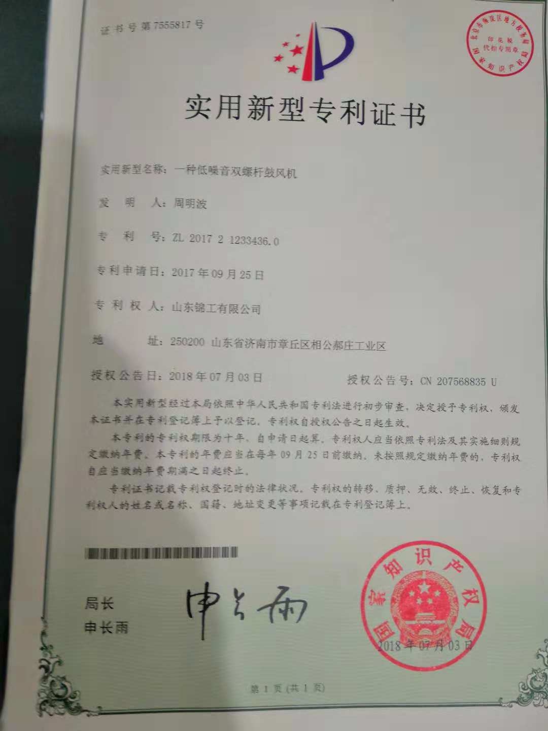 錦工風(fēng)機(jī)再獲多項(xiàng)羅茨風(fēng)機(jī)專利及軟著