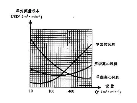 三種風機的投資成本對比見:三種風機流量—單位流量成本曲線圖(見圖2)。從上面曲線圖可以看出:
