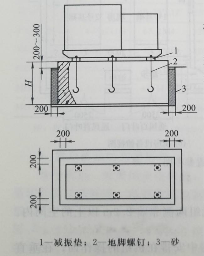 2、按三葉羅茨鼓風(fēng)機(jī)基礎(chǔ)與地腳螺栓圖做地基,混凝土基礎(chǔ)留有充裕的地腳螺栓安裝孔。